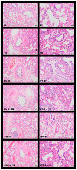 In hematoxylin–eosin (HE) examinations of lung tissue sections, normal lung tissue histology was observed in CG and TVG. While mild fibrosis and inflammation were observed in the lung tissue in 4% NG, significant inflammation and fibrosis were observed in 15% NG. In 4% N + TVG, no significant change was observed in alveolar enlargement and fibrous band formation due to the lesser damage in 4% NG. A significant improvement was observed in 15% N + TVG regarding alveolar enlargement and fibrous band formation compared with 15% NG (Figure 1).
