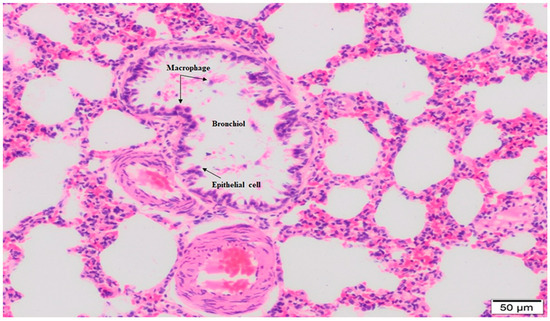 Based on 15% NaOCl application in lung histology, fibrosis was observed in the connective tissue around the vessels, bronchi, and bronchioles. Deteriorations were observed in the terminal and respiratory bronchioles, epithelial and subepithelial connective tissue, and muscle cells below. More peripherally, alveoli were lined with squamous and cuboidal epithelium, and interalveolar septa were found to be of increased thickness. There was local congestion in the veins. Macrophages were occasionally observed in the interalveolar spaces (10× magnification).