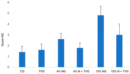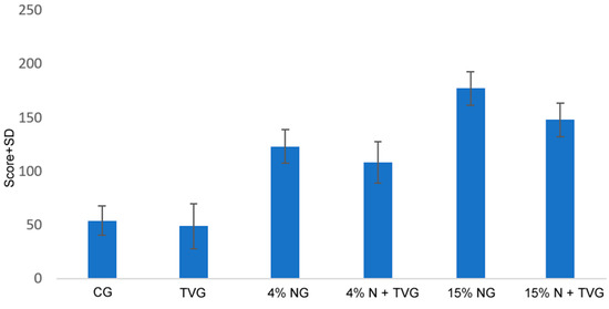 This difference between the groups was statistically significant between CG and 4% NG, TVG and 4% NG, CG and 15% NG, TVG and 15% NG, 4% NG and 4% N + TVG, and 15% NG and 15% N + TVG (Table 4).