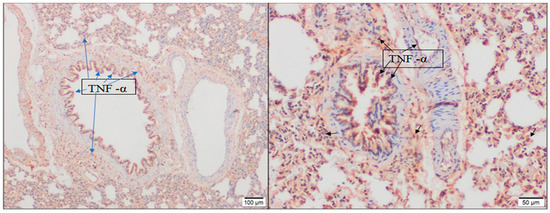 Sections of 4 μm thickness were taken from the lung tissue paraffin blocks on laminas. After the sections were kept in an oven at 60 °C for 1 h, they were deparaffinized by taking xylol for 3 × 5 min. Afterward, laminas were passed through decreasing series of alcohols and rehydrated (100%, 96%, 80%, 70%). The sections were rinsed with distilled water twice for 1 min to purify them from alcohol. In order to unmask the antigen, 1/10 diluted CitratBuffer (PH:6) (AP-9003-999, Thermo Fisher Scientific, Waltham, MA, USA) was applied with the PT Module (A80400012 LabVision, București, Romania). In the IHC Stainer, the laminas were attached to the rack slots and the cover plate. Washing was done with PBS for 5 min. The endogenous peroxidase activity of lung tissues left active with 3% hydrogen peroxide (TA-125-HP, Thermo Scientific, Fremont, CA, USA) for 10 min was blocked. It was washed with PBS. Protein was blocked (TA-125-PBQ, Thermo Fisher Scientific, USA) for 10 min. It was incubated with anti-TNF-α antibody (ab269772 Abcam, Cambridge, UK) (Dilue:1/100) for 2 h. Washing was done with PBS for 5 min. It was incubated in Amplifier Quanto (TL-125-QPB, Thermo Fisher Scientific, Waltham, MA, USA) for 20 min and incubated in HRP Polymer Quanto (TL-125-QPH, Thermo Fisher Scientific, MA, USA) for 30 min. Washing was done with PBS at each step. Staining was performed with DAB Chromogen (TA-125-HA, Thermo Scientific, USA) to identify positive cells. Hematoxylin (HHS32, Chemical Co., St. Louis, MO, USA) was applied for 1 min for floor staining. It was washed with distilled water for 2 × 1 min. The laminas were passed through a series of ascending grades of alcohol (70%, 80%, 96%, 100%), taken into xylol for 2 × 1 min, and closed with entellan.
