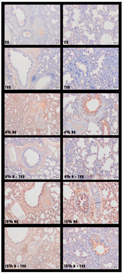 In CG and TVG, mild TNF-α expression was observed in the bronchiolar epithelium. In 4% NG and 15% NG, moderate and intense levels of TNF-α expression were observed in bronchiolar epithelium and macrophages in the alveolar lumen, respectively. 4% N + TVG and 15% N + TVG showed significant decreases in TNF-α expression.