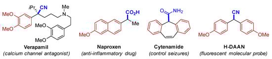The need for the development of new reactions that are based on applying the atom-economy concept [1] and avoiding the use of toxic reagents has become a consensus. Alcohols are highly attractive starting materials for synthesis because they are stable, have low toxicity, and are available. Direct nucleophilic substitution of an alcohol is attractive since water is, in principle, the only by-product [2,3,4,5]. However, this reaction is difficult because hydroxide is such a poor leaving group and therefore alcohols are classically derivatized to halides or pseudohalides prior to substitution, which results in the formation of vast amounts of waste. Thus, the development of new catalytic methodologies for dehydrative substitutions of alcohols was considered a central issue, as demonstrated by the inclusion of the “direct substitution of alcohols” in the ACS Green Chemistry Institute® Pharmaceutical Roundtable’s 2018 update on key green chemistry research areas [6]. In this context, the deoxygenative cyanation of readily available benzyl alcohols represent one of the most powerful methods for preparing α-aryl nitriles [7,8,9,10,11,12,13,14,15,16,17,18,19,20], an important class of core structures found in bioactive moleculars [21] and functional materials [22], and precursors that have applications in the synthesis of well-known drugs such as verapamil [23], naproxen [24], and cytenamide [25] as shown in Figure 1.