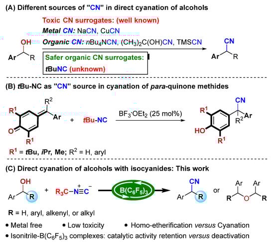 In recent years, B(C6F5)3 as a non-metallic Lewis acid has received widespread attention because of its strong Lewis acidity, commercial availability, and environmental friendliness [62,63,64,65,66,67,68]. Although still limited in its success, it mainly involves the B(C6F5)3-catalyzed activation of hydroxyl groups, as reported by Meng, Zhao and Chan [69,70], Marek [71], Tang [72], Maji [73], Gevorgyan [74], and Moran [75]. Inspired by these reports and building on our ongoing interest in the developing atom-economic reactions [76,77,78,79], we questioned if the direct cyanation of alcohols with isocyanides in the presence of B(C6F5)3 could be realized to meet the requirements of atom economy and green chemistry (Scheme 1C). However, this hypothesis may face considerable challenges, such as the following: (a) the catalyst should be stable in wet and Lewis basic conditions, and (b) tert-butylisocyanide/B(C6F5)3 and nitrile/B(C6F5)3 adducts can be easily formed, as reported by Berke and Erker and co-workers [80]. It is unknown whether B(C6F5)3 can maintain its catalytic activity during the current cyanation reaction, and (c) the catalyst should be able to dissociate from nitrile products. Finally, (d) another challenge is to suppress the B(C6F5)3-catalyzed homo-etherification of alcohols reported by Chan and co-workers [70].