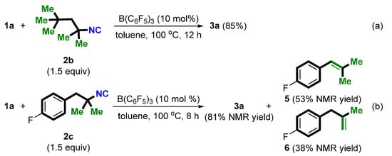 Based on the results above, a plausible mechanism is proposed in Scheme 6. First, tert-butylisocyanide 2a forms a reversibly Lewis adduct 8 with B(C6F5)3 [80]. The homo-etherification of alcohol in the presence of the B(C6F5)3 quickly delivers the ether 4 [70], which could furnish an adduct 9 with B(C6F5)3 through the oxygen center. Subsequently, the adduct 9 could break into an intermediate 10 and carbocation 11. However, an alternative reaction path for the formation of the carbocation 11 directly from alcohol in the presence of the in situ-generated strong Brønsted acid B(C6F5)3·nH2O or boron Lewis acid B(C6F5)3 (not shown, see Supporting Information for details) cannot be ruled out [69,70]. The carbocation 11 could then be intercepted instantaneously by the tBu-NC (2a) to afford an intermediate 12 with a borate anion 10 as the counteranion. The stability of the tertiary carbon cation is the driving force to break the C-N bond in 12, leading to the α-aryl nitrile 3 and 2-methylpropene by proton elimination via a tert-butyl carbon cation intermediate (supported by Scheme 2b) [81]. The borate anion 10, on the other hand, transforms into alcohol 1 with the regeneration of the B(C6F5)3 catalyst.