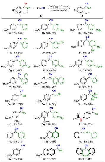 Diarylsubstituted alcohols bearing electron-donating (methoxy, alkyl) groups at the para-, ortho- or meta-positions of the benzene rings reacted smoothly (1a–1f). A variety of electron-withdrawing functional groups at the para-positions of the benzene rings such as -Br, -CF3, and -CO2Me were tolerated, affording the desired products in moderate to good yields (1g–1i). However, a low yield of 3j was isolated from 1j having an ortho-nitro group on the aromatic substituent. The naphthyl-containing alcohol 1k and heteroaryl-containing alcohol 1l also afforded the corresponding products in good to excellent yields. In addition, alkyl-substituted alcohols (R2 = methyl, ethyl, and tert-butyl) were also well-tolerated to afford the desired products 3m–3o. Of note, a competitive side reaction encountered in the reaction with 1m or 1n is the formation of styrene derivatives via the dehydration reactions of alcohols. Besides R1 = methoxy (1p–1q), the substituent R1 can be benzamide (1r). Benzhydrol 1s was tested but afforded the corresponding product 3s in low yield together with (oxybis(methanetriyl))tetrabenzene in 64% NMR yield. However, 1,2,3,4-tetrahydronaphthalen-1-ol (1t) and allylic alcohol (1u) underwent smooth cyanation. It is worth noting that the reported indium halide-catalyzed protocol with TMSCN as the cyanide source is not amenable to primary alcohol 1v for cyanation reaction [31]. Our system, however, gives reasonable yield for the same substrate. To our delight, the precursors for naproxen and cytenamide, respectively, can also be efficiently obtained in high yields by this protocol (3w and 3x).