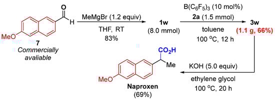 To disclose the synthetic practicability of the developed method, we studied a gram-scale reaction, and 66% yield of 3w was obtained, which might provide potential value in synthetic chemistry. Having established a protocol for the efficient synthesis of α-aryl nitrile 3w, (±)-naproxen, a nonsteroidal anti-inflammatory drug [24], was prepared in three steps from commercially available materials (Scheme 4).