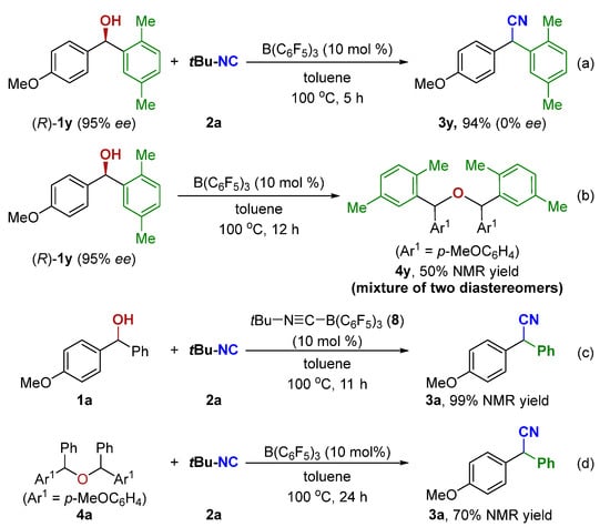To gain insight into the reaction mechanism, several control experiments were conducted. When an enantiomerically pure sample of (R)-1y was subjected to standard conditions, the resulting nitrile 3y was obtained in racemic form (Scheme 5a). Moreover, (R)-1y was also employed to perform the etherification reaction under the standard condition. The 1H NMR spectrum showed the ether 4y was obtained in 50% NMR yield with a 48/52 ratio of the two diastereomers (Scheme 5b). These control experiments support an SN1 pathway and rule out a concerted SN2 mechanism. The tert-Butylisocyanide-B(C6F5)3 adduct (8) was easily prepared [80] and used as a catalyst in the current reaction, affording the corresponding product 3a in 99% NMR yield (Scheme 5c). As shown in Table 1, entry 10, the reaction did form 3a in 20% NMR yield along with ether 4a in 30% NMR yield at 80 °C. Treatment of 4a with the standard setup then gave the desired 3a in 70% NMR yield (Scheme 5d).