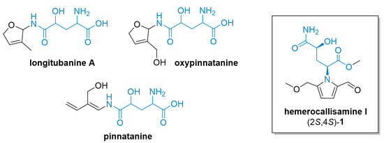 The structure of hemerocallisamine I (1) features a 4-hydroxyglutamine moiety anchored in a 2-formylpyrrole ring (Figure 1). Both of these subunits are abundant in nature and of synthetic interest [8,9,10]. In addition to hemerocallisamine I (1), several other 4-hydroxyglutamine derivatives, e.g., longitubanine A, oxypinnatanine, and pinnatanine (Figure 1), as well as their N-glycosides, have been isolated directly from H. fulva species [11,12,13]. Interestingly, the findings of Ogawa and coworkers indicate that oxypinnatanine might be the compound responsible for the sleep-promoting effect of H. fulva [14,15].