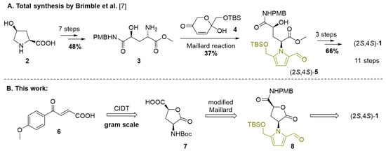 With the aim of smoothly constructing the 4-hydroxyglutamine framework, the published synthesis of (2S,4S)-1 started with commercially available cis-4-hydroxy-L-proline (2) to deliver amine 3 in 48% yield over 7 steps [7] (Scheme 1A). The critical step, Maillard-type condensation with dihydropyranone 4, provided the functionalized pyrrole (2S,4S)-5 only in a moderate yield of 37%. After the final deprotections and selective O-methylation, an 11-step synthesis of hemerocallisamine I (1) was successfully concluded with an 11.7% overall yield.