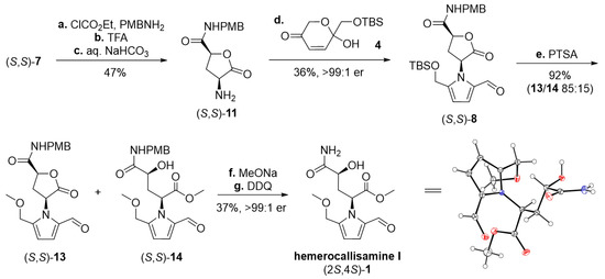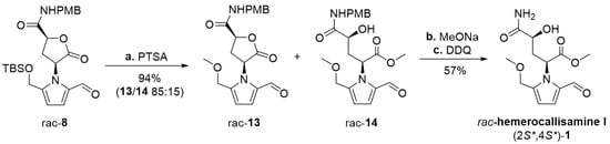 Having 2-formylpyrrole rac-8 in hand, the synthesis of racemic hemerocallisamine I (1) could proceed to the concluding steps (Scheme 3). Under conditions developed by Okada et al. [39] and later tailored by Brimble et al. [7], rac-8 was simultaneously desilylated and converted into a mixture of methyl ethers rac-13 and rac-14 in a ratio of 85:15. The crude product was directly used in a subsequent lactone opening and oxidative cleavage of the PMB group, thus providing (±)-hemerocallisamine I, (2S*,4S*)-1 (Scheme 3).
