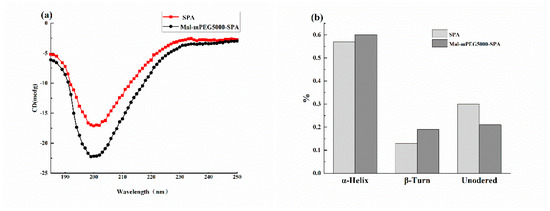 Circular dichromatogram (a) and the secondary structure (b) of SPA and Mal−mPEG5000−SPA.