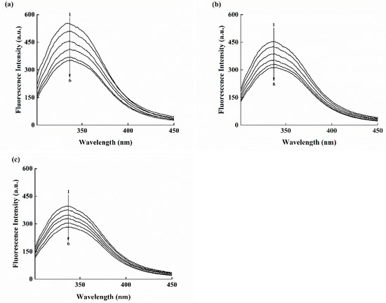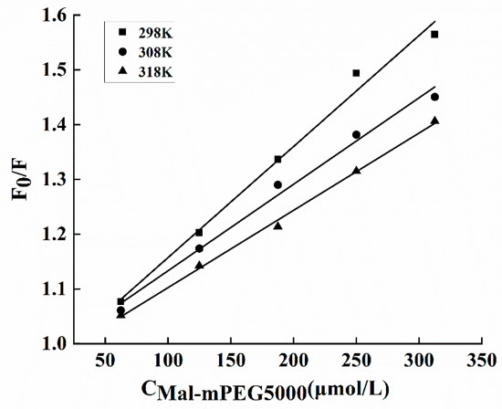Fluorescence spectroscopy is a highly efficient and reliable tool to explore the binding between different ligands and macromolecules. Fluorescence quenching can provide adequate information on the binding between small protein molecules, including binding mechanism, binding-specific parameters, and structural changes in the protein [30,31]. Fluorescence quenching hypotheses decline the fluorescence spectra intensity of a certain fluorophore using various molecular interactions [32,33]. In this study, Mal-mPEG5000 could linearize the SPA fluorescence quench at different temperatures (Figure 5a–c), and this quenching effect was observed over the emission wavelength range of 288–500 nm after being excited at 288 nm. It can be observed that the fluorescence intensity of enzyme protein decreased in the presence of Mal-mPEG5000 and the maximum emission wavelength shifted from 334 to 339 nm (redshift), indicating a change in the SPA microenvironment after Mal-mPEG5000 addition [34].