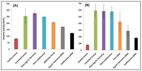 As liver enzymes are up-regulated in cancer, the level of various enzymes was determined to follow the progress of the disease [64]. The efficacy of the siRNA-based nanoparticle formulations was assessed 15 days after the last treatment by monitoring the levels of various liver enzymes, namely, aspartate transaminase (AST) and alanine transaminase (ALT), in treated BALB/c strain of mice. All analyses were carried out in triplicates (n = 3).