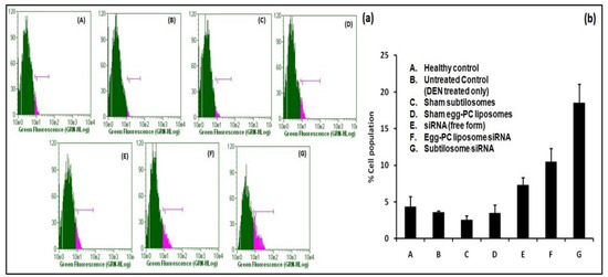 Apoptosis in liver cells analyzed by BrdU staining. Staining was performed using a BrdU staining kit (BD Biosciences), as described in the Section 4. (a) Stained-cell population from various groups of experimental animals treated with siRNA formulations where (A–G) represent healthy control, untreated control (DEN treated only), sham subtilosome treated, sham egg-PC liposome treated, free siRNA treated, egg-PC liposome siRNA treated and subtilosome siRNA treated groups, respectively. (b) The total percentage cell population (depicted as bar diagram) observed in various experimental groups.