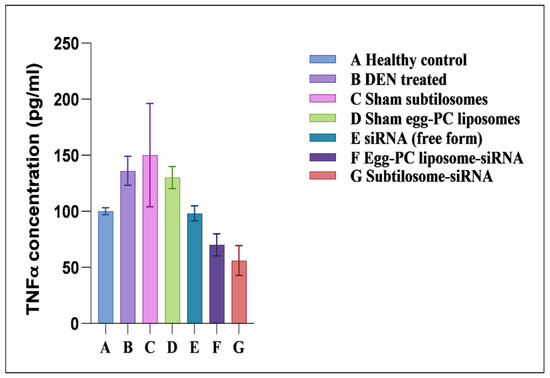 TNF-α-expression profiles of animals treated with different siRNA formulations. TNF-α levels were measured in plasma, as described in Materials and Methods. Data represented here are the mean of three separate experiments ±SD (siRNA subtilosomes versus free siRNA p < 0.05, siRNA-PC liposomes versus free siRNA p < 0.05, siRNA subtilosomes versus siRNA-PC liposomes p value not significant).