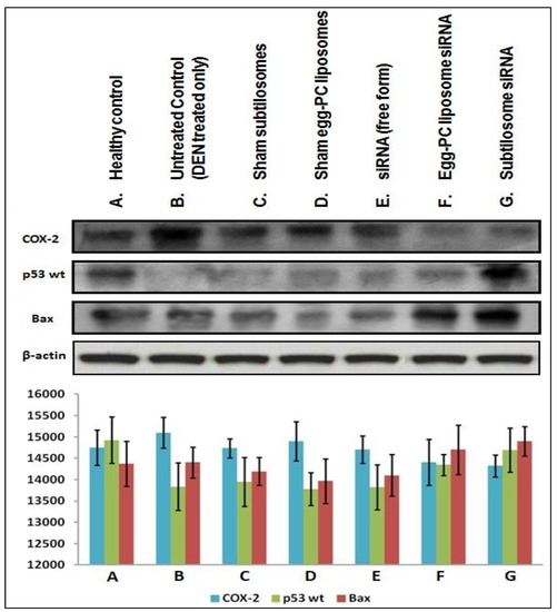 As shown in Figure 7, the subtilosome-based siRNA formulation inhibited the expression of COX-2 in the cancer cells. The egg-PC-liposome-based siRNA formulation was also successful in the containment of the COX-2 enzyme in the cancer cells, although less efficiently than the subtilosome-based siRNA formulation (subtilosome siRNA vs. egg-PC-liposome siRNA; p value < 0.05). While the treatment with naked siRNA inhibited the expression of COX-2 non-significantly (subtilosome siRNA vs. naked siRNA; p value < 0.01), the sham subtilosome-based formulation and the untreated control groups failed to inhibit COX-2 expression at the same dose. The down-regulation of the COX-2 expression was most prominent in the case of the subtilosome-siRNA nanoparticles, followed by that of the egg-PC-liposomal siRNA formulation. The potential of COX-2-mediated apoptosis was further established by determining the expression pattern of p53wt and Bax in the treated cells. The p53 level was significantly resurrected in the mice treated with subtilosome-based siRNA. The siRNA egg-PC-liposome-based formulation also induced the expression of p53 in the treated group. The free form (the naked siRNA-based formulation), did not induce p53 expression in the treated animals. The vehicle controls and untreated groups failed to induce the expression of p53 (wild type) in the animals (Figure 7).