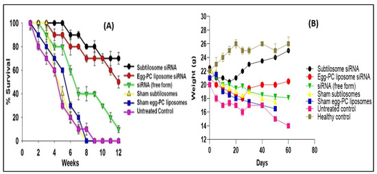 The survival of animals treated with various siRNA-bearing subtilosome-based formulations was considered a measure of its efficacy. The animals were monitored twice a day for their mortality for 12 weeks after the beginning of the therapy. The weights of the individual mice were monitored for 8 weeks.