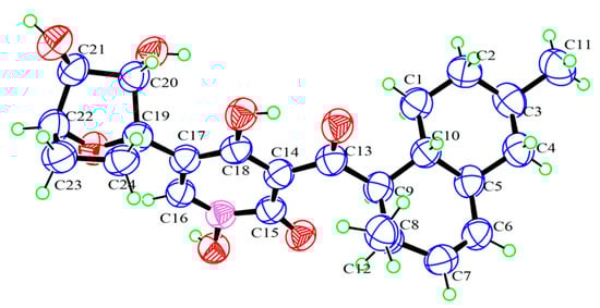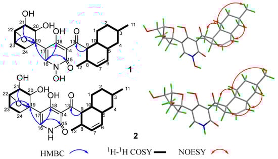 Compound 1 was obtained as a yellow crystal. The molecular formula was deduced as C24H31NO7 based on the HRESIMS ion peak at m/z 468.19861 [M + Na]+ (calcd. for C24H31NO7Na = 468.19927). Its IR (KBr) spectrum exhibited absorptions at 3434 cm−1 (hydroxy), 1649 cm−1 (carbonyl), and 1605/1552/1446 cm−1 (aromatic heterocycle). Compound 1 had the same molecular formula with N-hydroxyapiosporamide (3) and showed a high degree of similarity in UV absorption. The NMR spectra displayed two methyls, five sp3-methylenes, eight sp3-methines, three sp2-methines, one sp3-quaternary carbon, five sp2-quaternary carbons (including two carbonyls) (Table 1), which was also similar to those of compound 3, especially for the important 1H NMR signals, such as two methyl groups at H3-11(δH 0.94) and H3-12 (δH 0.82), a single special hydrogen signal at H-16 (δH 7.93), two olefinic protons at H-6 (δH 5.41) and H-7 (δH 5.60). The above evidence suggested that compound 1 has a similar skeleton with compound 3. The 1H-1H COSY correlations (Figure 2) from H2-1 (δH 0.88 and 1.95) to H-10 (δH 1.58), H-3 (δH 1.50) to H3-11, and H-8 (δH 2.85) to H-12 proved the existence of a decalin moiety. The relative configurations of this part were confirmed by the NOESY correlations (Figure 2) from H-10 to H3-11/H3-12 and H-5 (δH 1.83) to H-3/H-9 (δH 4.45), and indicated that compound 1 has the same decalin moiety as compound 3. The 1H-1H COSY correlations from H-20 (δH 3.87) to H2-24 (δH 1.63 and 2.25) and the HMBC correlations (Figure 2) from H-21 (δH 4.00) and H2-23 (δH 1.70 and 2.25) to C-19 (δC 89.4) confirmed the presence of an oxygenated cyclohexane moiety in compound 1. However, there was a large chemical shift difference between these two compounds at C-19/20/21/22 (δC 89.4, 82.1, 82.9, 78.6 for 1; 70.4, 60.5, 57.7, 67.2 for 3). Nevertheless, there is still one degree of unsaturation in the structure 1, implying an oxygen bridge in this cyclohexane moiety, but the HMBC correlations cannot be used to confirm it. The key HMBC correlations from H-9 to C-13 (δC 211.4), H-16 to C-15 (δC 159.9)/C-18 (δC 173.2)/C-19 indicated that the decalin and hexane moieties substituted at C-13 and C-17 of the 4-hydroxy-2-pyridinone part. The crystal of compound 1 was fortunately acquired in methanol/water (v/v, 1:1) solution. The results of the X-ray (Figure 3) analysis (Flack parameter = −0.15 (11), CCDC: 2218951) confirmed an oxygen bridge between C-19 and C-22 forming the furan ring and led to the final determination of its absolute configuration as 3R, 5S, 8R, 9R, 10R, 19S, 20S, 21S, 22S. This novel 4-hydroxy-2-pyridone was named furanpydone A.