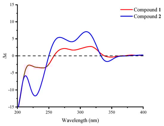 The isolated compounds were evaluated for antibacterial activity against pathogenic microorganisms including three Gram-negative strains (Escherichia. coli ATCC11775, Pseudomonas aeruginosa ATCC10145, Ralstonia solanacarum []), and four Gram-positive strains (Staphylococcus aureus ATCC6538, methicillin-resistant S. aureus ATCC43300 MRSA, Clostridium perfringens ATCC13124, and Bacillus subtilis ATCC6051), and two pathogenic fungi (Candida albicans ATCC10231 and Candida glabrata ATCC2001). The tested bacterial suspensions were incubated in Luria–Bertani (LB) medium and fungi in Mueller–Hinton agar (HMA) medium at 28 °C for 12 h and diluted to be 1 × 106 CFU/mL by the same medium. Then, the DMSO solution of each compound was diluted into the corresponding concentration using the LB or MHA medium; 100 µL solution of compound was added into the first well of a 96-well plate and resulted the initial tested concentration of each compound to be 50 µmol/L (DMSO < 0.5‰ in each well) and the concentration of each compound to be 25 µmol/L (DMSO < 0.5‰ in each well) in the second well of a 96-well plate after then following this method in sequence, adding 100 µL microbial suspension into a 96-well plate. The ciprofloxacin and DMSO were used as the positive and negative controls, respectively. All experiments were repeated three times. MIC values were assessed by whether compounds can inhibit the growth of microorganisms [].