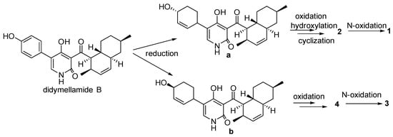 We propose a possible biosynthetic pathway for compounds 1–4. Didymellamide B was the key intermediate in the biosynthesis of these compounds []. The intermediates a and b were obtained by reduction from didymellamide B. Compound 2 was obtained by oxidation, hydration and cyclization reaction from a, and compound 1 was syntheszed by further oxidation. Compound 4 was obtained by two oxidation reactions from b, and compound 3 was syntheszed by further oxidation. (Figure 5).
