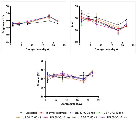 | Treatment | pH | °Brix | TTA | Brightness | hue° | Chroma | |