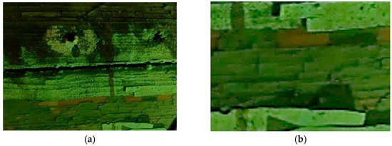 The craquelure was presumably induced by the imperfect adhesion between the finishing layer and the underlying ones but also by exposure to UV radiation and a high level of relative humidity [34]. In the overlapping areas of the red paint on the yellow one, such cracks are not limited to the surface only, but reach the underlying yellow layer. All types of branched cracking are according to variable, straight, or concentric crosslinks. These crosslinks intersect each other, forming islands of various sizes and shapes. Some areas of the carriage, such as the panels, show that the symbols are characterized by the absence of the finishing layer (Figure 10). Indeed, in these areas, it is possible to detect the underlying paints, which have a different fluorescence when observed in ultraviolet light (Figure 10b).