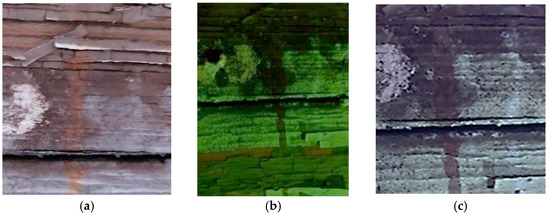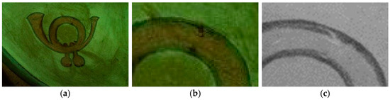 The multispectral investigation performed on the symbol present on the right and left side of the carriage underlined an uneven response under UV radiation (Figure 5a,b). Indeed, darker areas could be noticed, which appeared to be lighter in IR reflectography (Figure 5c). The areas in which the fluorescence is less marked (darker in the photo) present a greater reflection of the IR radiation, and these areas appear lighter. These differences can be presumably related to the loss of the finishing layer.