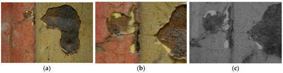 Details of the iron cart structure: leakage due to corrosion; (a) Image in visible light; (b) Image in UV fluorescence; (c) Image in IR reflectography.