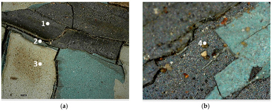 Optical microscope images of the cart’s stratification. (a) Image collected at 50× magnification in which the dark grey (1), greenish grey (2), and light grey (3) layers are visible; (b) Image collected at 200× magnification where the deposited particulate is present (4).