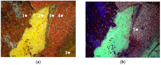 Optical microscope image of the layering on the carriage: (a) Image collected in VIS light, showing the substrate (1), the bright yellow layer (2), the yellow-brown layer (3), that is above or under the red layer, and the red layer (4); (b) Image collected in UV light, where the finishing layer-with a bluish fluorescence can be observed (5) above the colored layers.