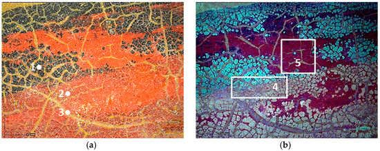 Optical microscope image (200× magnification) of the area corresponding to the postal service’s symbol. (a) Image collected in VIS light showing the cracking process with thinner (1–2) and thicker cracks (3) that reach the yellow paint; (b) Image collected in UV light highlighting the islands of different sizes and shapes where the finishing layer is present (4), and an area with different fluorescence in which the layer is absent (5).