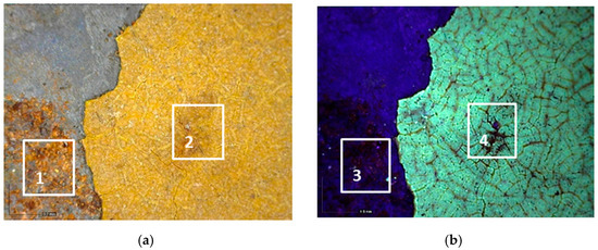 Optical microscope images (200× magnification) of one of the metal panels: corrosion of the laminate (1–3), causing the darkening of the yellow paint (2–4). (a) Image collected in VIS light; (b) Image collected in UV light.