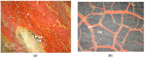 Optical microscope images of the areas showing the black paint. (a) Image (50× magnification) collected in VIS light showing the black paint (1) under the yellowish brown (2) and red (3) layers; (b) Image (50× magnification) collected in VIS light showing the black layer (4) above the red one (3).