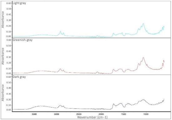 Spectroscopy FT-IR was performed to characterize the paint materials at the functional-group level. The spectra were gained using the Nicolet Summit FT-IR spectrometer (Thermo Fisher Scientific, Waltham, MA, USA) and equipped with the Everest™ Diamond ATR accessory, with an instrumental resolution of 8 cm−1; 32 scans were performed on each sample, and the respective spectra were analyzed using the database library and the scientific literature. The analysis was carried out on 18 samples taken from the areas highlighted in Table 11. Samples (1 × 1 mm) were taken from the selected areas using a scalpel to sample the whole layer structure of the stratigraphy.