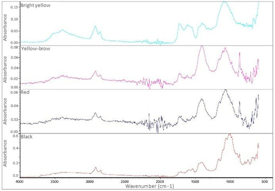The black paint used for decorations on the red one is characterized by purely organic components, as shown by the SEM/EDS analysis (Table 10). No chromophore elements were detected. Thus, the black color was most likely given by the carbon present in the pigments of organic origin (e.g., carbon black). Traces of silicates, zinc, barium, sulfur, and calcium were also found, similar to the other paints.