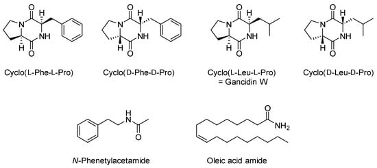 Phytochemical studies on M. polymorpha have shown this liverwort species produce mainly sesquiterpenoids and aromatic compounds belonging to the bisbibenzyl group []. Extracts obtained from endophytes grown on both solid [] and liquid (present study) media did not show the presence of plant metabolites. The most characteristic components of M. polymorpha endophytes are the diketopiperazines. The present studies showed the major compounds of the ethyl acetate extract are cyclo(l-phenylalanyl-l-prolyl) and cyclo(l-leucyl-l-prolyl), also known as gancidin W. In addition to these two components, their stereoisomers were also identified, cyclo(d-phenylalanyl-d-prolyl) and cyclo(d-leucyl-d-prolyl). 2,5-Diketopiperazine derivatives, also called cyclic dipeptides, are the simplest peptide derivatives in nature that are formed by the condensation of two amino acids. They are an important category of bioactive substances with various structures []. These compounds have recently received considerable attention due to their structural stability and significant pharmacological potential [,]. Cyclic peptides are widespread among endophytic microorganisms, but these are not the only metabolites found in these organisms. The current studies showed the major components of fraction END4 were N-phenethylacetamide and oleic acid amide. Arylethylamides and fatty acid amides are also common compounds produced by endophytic microorganisms, especially fungi. They have also been observed to be broadly bioactive against various disease agents [,].
