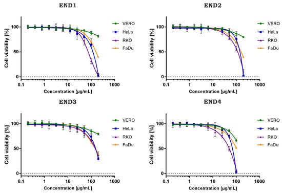 The cytotoxicity evaluation of the tested samples is presented in Table 3. In the case of non-cancerous VERO cells, the CC50 values were extrapolated from dose-response curves (inhibitor vs. normalized response) using GraphPad software (Figure 3). The ethyl acetate extract (END1) showed the lowest cytotoxicity towards VERO with a CC50 of 792.1 µg/mL. Subsequent fractionation (END3-END4) resulted in an increase of toxicity towards this cell line. END1 showed potentially high anticancer selectivity with an SI between 5 and 11.1. Subsequently obtained fractions END2 and END3 showed higher CC50 values on cancer cell lines, and a decrease in anticancer selectivity was observed. Fraction END4 showed a significantly (p < 0.05) higher toxicity than the initial extract and the other fractions but a lower selectivity.