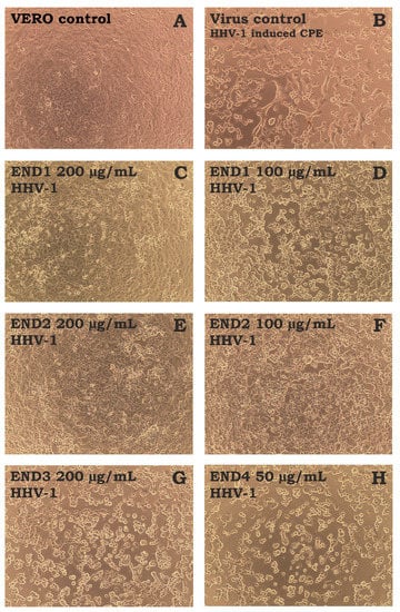 The influence of endophyte extract and fractions (END1-4) on HHV-1-induced cytopathic effect in VERO cells ((A)—cell control; (B)—HHV-1-induced cytopathic effect, virus control; (C,D)—infected cells treated with END1 at 200 and 100 μg/mL, respectively; (E,F)—infected cells treated with END2 at 200 and 100 μg/mL, respectively; (G,H)—infected cells treated with END3 at 200 μg/mL or END4 at 50 μg/mL, respectively).