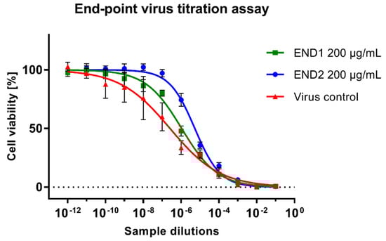 Samples collected from CPE assays were further studied to assess the reduction of HHV-1 infectious titer and viral load. An endpoint virus titration assay (Figure 5) revealed the viral load was reduced by END1 (200 µg/mL) and END2 (200 µg/mL) by 0.61 ± 0.13 and 1.16 ± 0.17 logCCID50/mL, respectively. It could therefore be concluded that both fractions do not show significant antiviral potential since a reduction of infectious titer by at least 3 log is required. The HHV-1 infectious titers in samples treated with END3 and END4 were comparable to the VC.