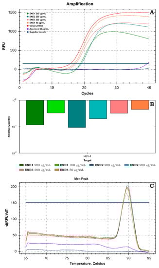 The amplification curve from real-time PCR analysis of DNA isolates from samples treated with endophyte fractions compared to the VC is presented in Figure 6A. The subsequent relative quantitation (ΔCq) method using CFX Manager Dx Software (Figure 6B) revealed END1 at 200 and 100 µg/mL decreased the viral load by 0.93 and 0.48 log, respectively. Fraction END2 at the same concentrations exerted noticeably higher inhibition, reducing the viral load by 1.03 and 0.7 log, respectively, compared with the VC. Further fractionation (END3 and END4) decreased the inhibitory effect on the HHV-1 replication. The melting curve analysis (Figure 6C) carried out after the real-time PCR amplification showed a single peak at 89.5°C for all tested samples; thus, the same amplicon was found in all samples, and no dimers of primers were observed. Acyclovir (60 µg/mL), used as a reference antiviral drug, prevented the development of CPE in the HHV-1-infected cells and the production of infectious viral progeny. Furthermore, real-time PCR amplification did not show any conclusive evidence of HHV-1 DNA in virus-infected VERO cells treated with acyclovir.