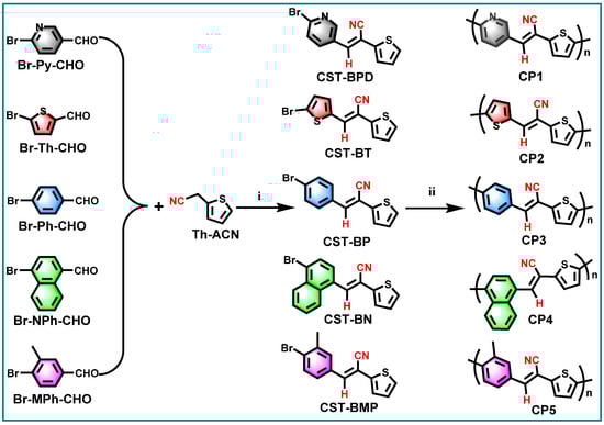 Two-step synthesis CST-based conjugated polymers CP1–CP5: (i) Knoevenagel condensation: t-BuONa/piperidine, MeOH/EtOH, RT/reflux; (ii) Pd(OAc)2/Pd2(dba)3, P(t-Bu)2Me-HBF4/P(o-MeOPh)3, K2CO3/Cs2CO3, PivOH, and toluene under Ar at 150/110 °C.
