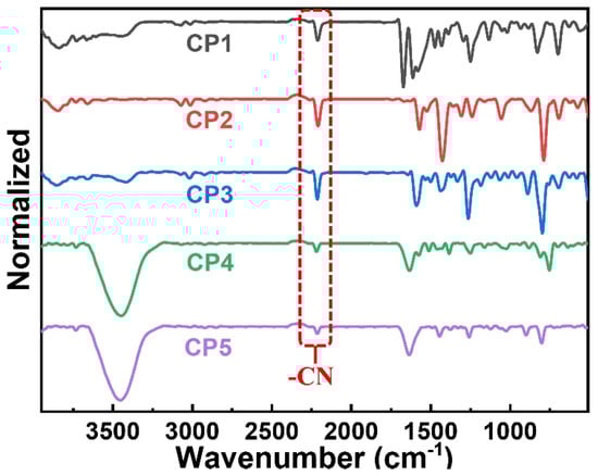 As shown in Figure 1, a series of CST-based polymers, CP1–CP5, were synthesized separately in five pots of Pd-catalyzed C–H direct arylated coupling polymerization [24,25,26] starting from building blocks CST-BPD, CST-BT, CST-BP, CST-BN, and CST-BMP, which were facilely obtained via Knoevenagel condensation between varied bromo-substituted aromatic aldehydes and 2-(thiophen-2-yl)acetonitrile (Th-ACN). The structures of these CST-based CPs were characterized by Fourier transform infrared (FT-IR) spectra (Figure 2). All CPs displaying peaks at ~1640 cm−1 wavelength were assigned to the stretching vibration of C=C double bonds, revealing the presence of vinylene linkers. The infra-red absorption peaks at about 2232 cm−1 were the skeleton vibration of the –CN groups in all these CPs.