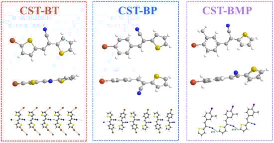 The above point was also experimentally supported by single-crystal X-ray analysis. To explore the impact of CST substitutes, the single crystals of monomers CST-BT, CST-BP, and CST-BMP were successfully grown and subjected to X-ray crystalline structural analysis (Figure 3). Among the monomers, CST-BT and CST-BMP were two newly reported crystals (CCDC2190738 and CCDC2190742, CIF files in SI). The results demonstrated that the molecules of CST-BT, CST-BP, and CST-BMP pertained to the triclinic space group. Z = 4, with cell parameters of a = 6.8270 Å, b = 23.045 Å, c = 7.4519 Å, α = 90°, β = 97.604°, and γ = 90° for CST-BT; Z = 4, with cell parameters of a = 3.9619 Å, b = 24.465 Å, c = 12.6409 Å, α = 90°, β = 96.409°, and γ = 90° for CST-BP. Z = 2, with cell parameters of a = 7.5030 Å, b = 8.5195 Å, c = 11.1655 Å, α = 86.355°, β = 79.693°, and γ = 67.892° for CST-BMP. For the one-dimensional chain structures, the intermolecular hydrogen bonds were formed in CST-BT, CST-BP, and CST-BMP with distances of 2.496 Å, 2.638 Å, and 2.718 Å, respectively. Based on the data, the spatial potential resistance effect had a significant impact on the distance of the CST unit.
