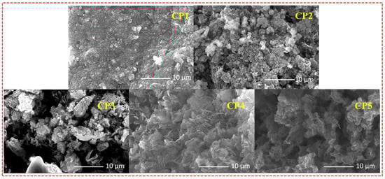 To gain deeper insight into the morphologies of varied CST-based CPs at micro- and nanoscales, all the CPs were investigated by scanning electron microscopy (SEM). The morphology and structure of photocatalysts in promoting the separation of photogenerated carriers contribute to the improvement of photocatalytic activity. CP1–CP5 each displayed a well-defined dimension and morphology (Figure 4), which showed that the morphologies of CP1–CP5 are different from each other’s. The enhanced planarities of starting monomers CST-BPD and CST-BT endowed CP1 and CP2 a tightly packed irregular morphology. Nevertheless, CP4 and CP5 displayed a dendritic-like morphology, which was consistent with the spatial steric resistance of the naphthalene ring and the methyl group. Compared with the other CPs, the SEM morphologies of CP3 had a more regular lamellar compact structure, which was instrumental in charge transport and separation of carriers to the photocatalytic reaction.