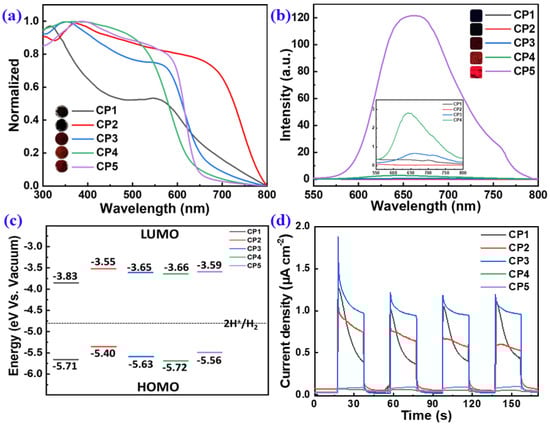 The opto-electronic properties of CP1–CP5 were systematically studied by UV-vis absorption, photoluminescence (PL), transient photocurrent response (TPR) and cyclic voltammetry (CV) measurements (Figure 5). The UV-vis diffuse reflectance spectroscopy (DRS) revealed that all of the CPs had extensive absorption in the range of 300–600 nm (Figure 5a), which benefits visible-light harvesting. This suggests that introducing the electron-D/A-capability units into the conjugate backbone can tune the energy level of the CPs and lead to changes in the spectral absorption of the materials alteration. The absorption trend was consistent with the colors of CPs: better absorbance toward longer wavelengths had deeper colors (insets in Figure 5a). The nitrogen atom of the pyridine ring in CP1 had the induction effect of electron absorption and the conjugation effect of electron absorption, which led to the wide absorption range and darker color of CP1 in the state of solid aggregation. CP2 with a range absorption too wide led to a narrow band gap, which resulted in an easier return of electrons from the excited state to the ground state; thus, the recombination of photogenerated electron holes sharply increased, reducing the effect of hydrogen production. The optical bandgaps (Eg) of CP1–CP5 estimated by the plotting curves of (αhν)2 vs. hν were 1.88, 1.85, 1.98, 2.06, and 1.97 eV, respectively (Figure S5). Although CP1–CP5 had no solubility in common solvents such as CH2Cl2, CHCl3 and toluene, they all could form colloidal dispersions in N-methyl-pyrrolidinone (NMP). The UV-vis spectra of CP1–CP5 colloidal dispersions in NMP exhibited maximum absorption peaks at 420.5, 526.5, 455, 426.5, and 531.5 nm wavelengths, respectively (Figure S4).