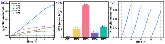 The PHP performances of the polymers (Figure 6) were evaluated by using water and ascorbic acid as a hydrogen source and an SED, respectively. The HERs of CP1–CP5 were 0.00, 1.89, 7.60, 1.17, and 2.47 mmol h−1 g−1, respectively. The zero HER of CP1 might be ascribed to its being ascribed to its deepest LUMO levels with the smallest driving force for the proton reduction (Figure 5c). It shows that a stronger electron-donor effect is more conducive to affecting the efficiency of hydrogen production. An HER of 7.60 mmol h−1 g−1 for CP3 was achieved, which was much higher than that of other CPs and outperformed most of the reported linear CPs (Table S1). Because the electron-donating ability of thiophene and thiophene is equivalent, it was hard to form a D–A effect for CP2 that could be corroborated by the LUMO level and the HOMO level (Figure 5c). As revealed by DFT, the major factor on the PHP performance of CP4 and CP5 was the steric hindrance of the building blocks, which was greatly increased after introducing the naphthyl and methyl groups into CP4 and CP5, respectively. The high steric hindrance decreased the planarity and the effective conjugation lengths of the polymeric chains, which was unfavorable to the intramolecular D–A interaction and the internal spatial charge carrier separation; thus, it was less conducive to the surface photocatalytic redox reaction.