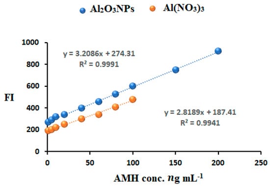| Proposed method | Spectrofluorometric measurement in the presence of Al2O3NPs and Al(NO3)3 | 0.1–200 ng mL−1 | AMH-Al2O3NPs | |