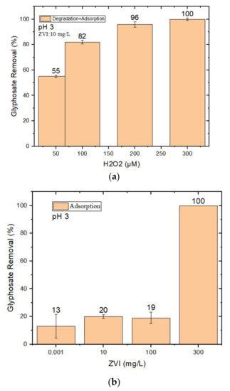 As shown in Figure 1a, complete GLY removal could be achieved at pH 3 by using 10 mg/L nZVI and 300 μM H2O2. Lower H2O2 concentrations were less effective, most likely because of lower hydroxyl radical (HO•) generation when H2O2 is low. Higher H2O2 concentrations were not tested because their use would increase treatment costs (300 μM H2O2 would cost approximately USD 0.009/m3 [46]) and because effectiveness would decrease at a certain point due to HO• scavenging by the H2O2 itself [48]: