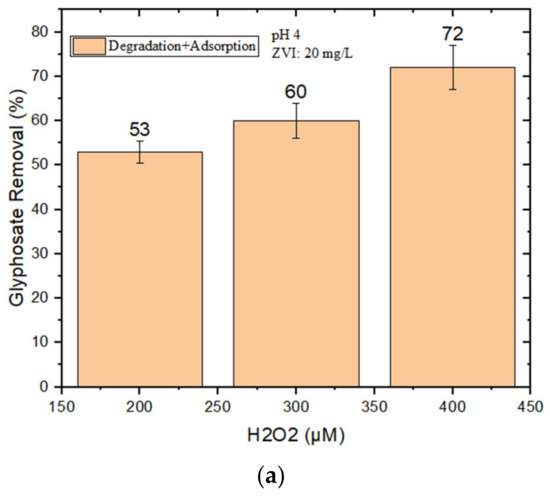 It was not possible to achieve satisfactory GLY removal at pH 4 in the presence of 10 mg/L nZVI + H2O2. For this reason, higher loadings of nZVI (20–40 mg/L) were tested, but the adsorption of GLY by nZVI alone (i.e., without H2O2) was also checked. Limited adsorption was observed with 20 mg/L nZVI, which was then used to perform further degradation experiments at different concentrations of H2O2 (200–400 μM). However, as shown in Figure 2a, the maximum GLY removal by nZVI + H2O2 was, at most, only 72% when using 400 μM H2O2 at pH 4.