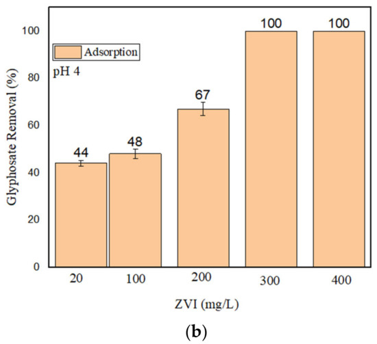 (a) GLY removal (%) by nZVI (20 mg/L) and H2O2 (200–400 μM) at pH 4; (b) GLY removal at pH 4 by nZVI alone (with different loadings).
